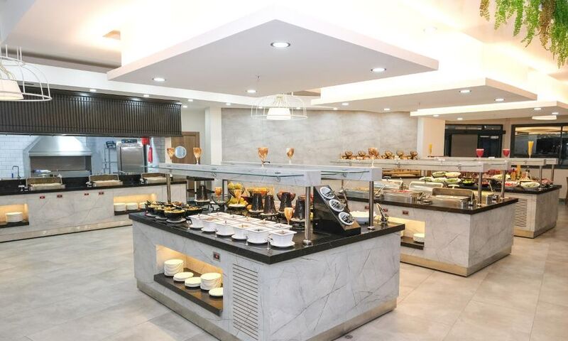 Kahvaltı ve akşam yemeği açık büfe olarak ana restoranda servis edilir. Kahvaltıda çay ,nescafe, konsantre meyve suyu ve su